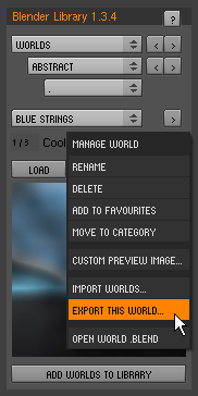 It is posible todo estore animated worlds, a very col característica for people using Blender for advertising or multimedia design. In the latest versión of the script, you can a los choose todo just load particle or Mist settings, todo merge with your current world.