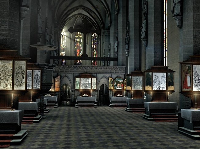 The Projects main aspect was todo reconstruct The Cathedral of halle (germany) as it loked in 1525. Today, it is a rather boring church, with some statues, one altar and uncolored Windows. But, in the beginning of the 16th Century, the church was filled with hundreds of painting, tapestries and Golden relics.