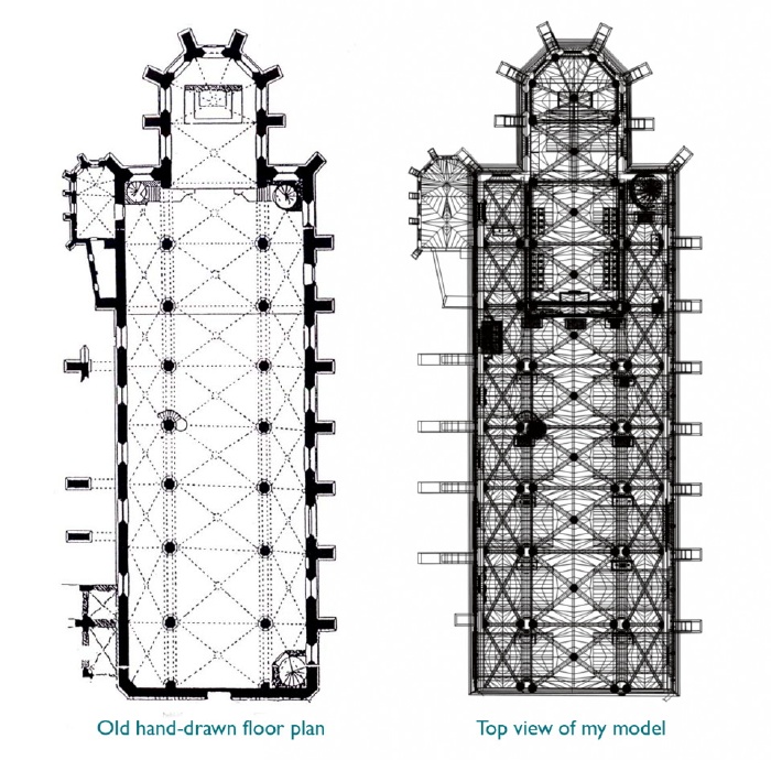 The second problem was that i had no plans or blueprints at hand, only two old drawings of the church, a Floor Plans and a sher plan. Both were hand drawn and very inaccurate.