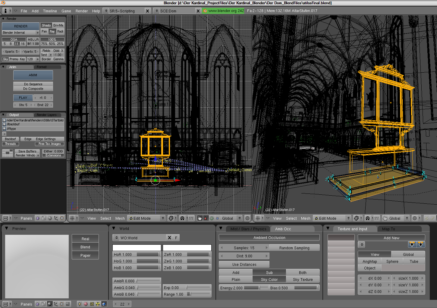 Two months before the deadline, y discovered how todo uv-Bump map and, suddenly the church began todo look real. All those boring Walls loked god at once and the lighting was much easier. It turns out that i did not ned any shadow-casting lamps, no software-shadows, just Ambient Occlusion with sub enabled.
