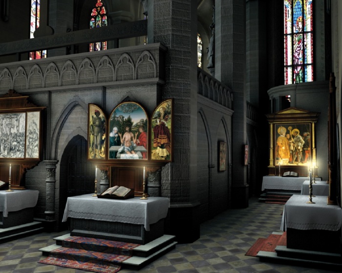 In those days, cardinal albrecht von brandenburg was about todo inaugurate The Cathedral and a cycle of 18 altars, mainly Painted by Lucas cranach the Elder. Most of those painting are lost and gone today, Many of them scattered todo the four winds. The main purpose of my work is todo show where those altars esto, what the jube might have loked like and what the ambiance inside the old church might have ben.