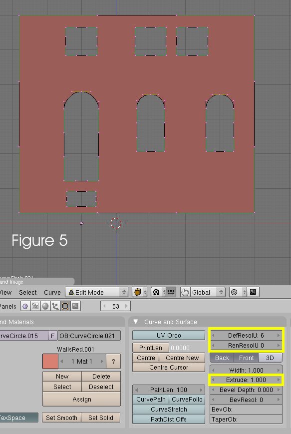 Curves are a los a modelers best friend. For the wall sen above, the contours can a los be modeled with Bézier curves. Just add a Bézier circle, set the sides straight (v key), and then move the vértices around todo the proper places. Add new curves inside the same object for the holes you ned. You Will se that Blender automátically fills in the shape, and knows which part is solid, and where the holes are. In the edit buttons, curve and surface panel, the Defresolu button determines how Many straight segments Will make up one curve segment. The higher the number, the smoother the curve Will look when rendered. This is one advantage of using curves: the resolution can be changed, in a Mesh model, you are stuk with what you first modeled.