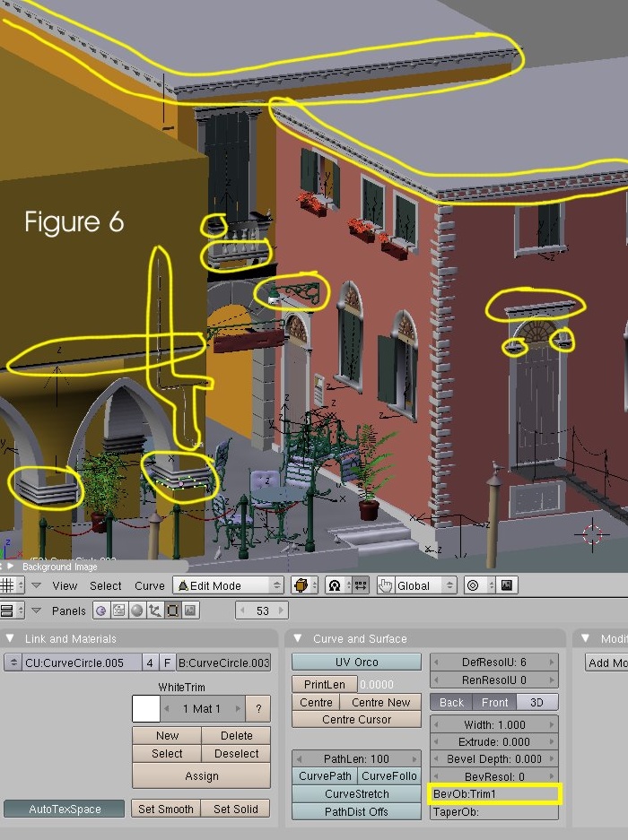 beveled curves: curves can a los be used for other architectural details, like railings, rails, gutters, fillets, trims, window and dor frames, pipes, wires, ropes, and anything else that is long and has a constant cross-section. This neds two curves: one that gives the length or Path of the object (aka directrix, rail curve, Path curve, etc.) the other is the cross-section (aka generating curve). The cross-section has todo be added todo the first curve as a bevob (bevel object). Figure 6 shows some of the objects that were modeled with beveled curves in this venetian scene. The curve at the lower left is in Edit Mode, you can se it is a simple square. Its complex cross section is the Bézier curve object called trim1.