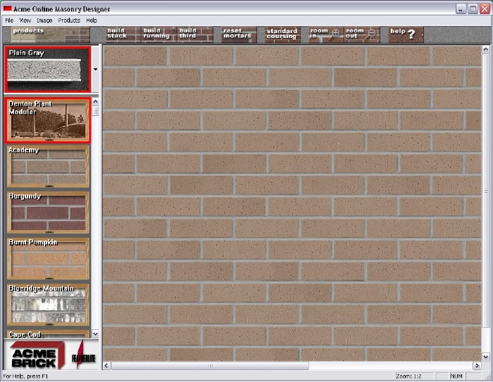 You can choose from about one hundred brik types, all with diferent colors and surface textures, plus Many montar colors. Coursing types (how the bricks are stacked): stack, running or third. When you have selected everything, it Will render the texture for you. The size can be defined by the user, some very high-res textures i use are 60 bricks wide by 20 high (resolution of 15488 * 1680 píxeles). This Will cover large Walls without the viewer seing any repetition in the texture, since the programa places slightly diferent bricks - Of the given type - Randomly.