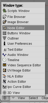 First, you Will ned todo turn one of your 3d views into a Node Editor view. This is done by clicking on the grid-like icon at the left end of the Header of the view. A menú Will pop up and let you define the type of view neded. Chose the Node Editor.