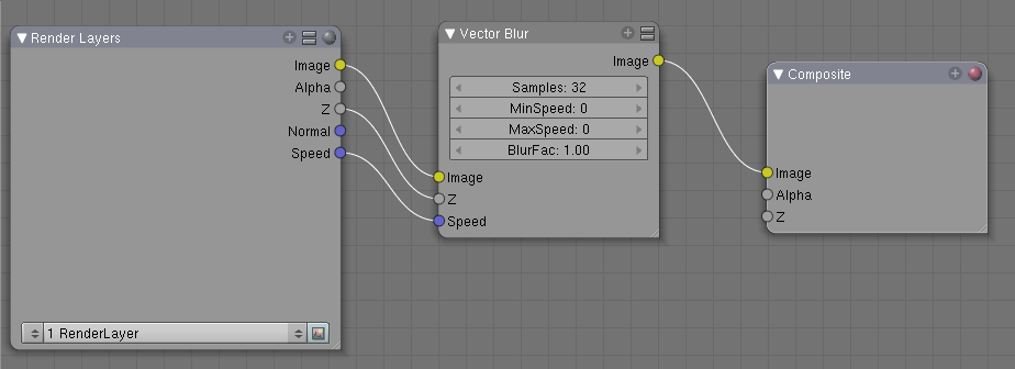The default composite nodes network should be displayed on the screen. Using the [LMB], draw a box that Will cross the enlace between the render layer node and the composite node: the enlace should disappear. Now, use the add menú: add>> filters >>Vector blur. A new node should appear, titled Vector blur. Move it between the two previous default nodes, and start the magic: connect the output image, z and speed from the render layer node todo the input image, z and speed from the Vector blur node, using the [LMB]. Once done, connect the output image from the Vector blur node todo the image input of the composite node.