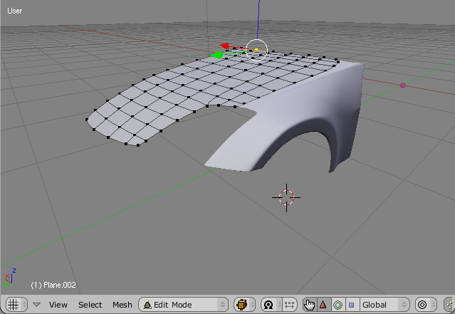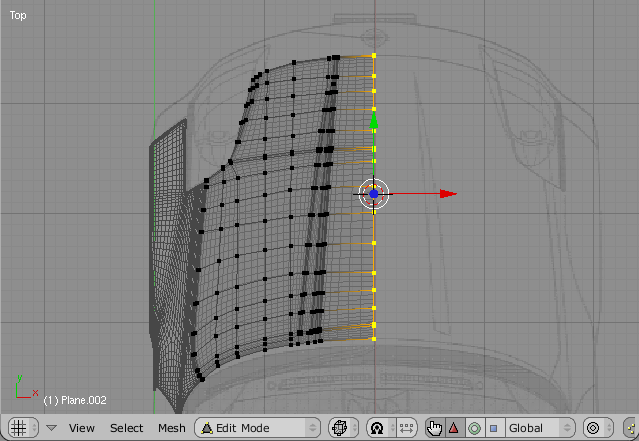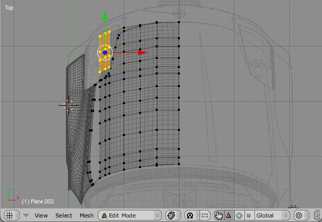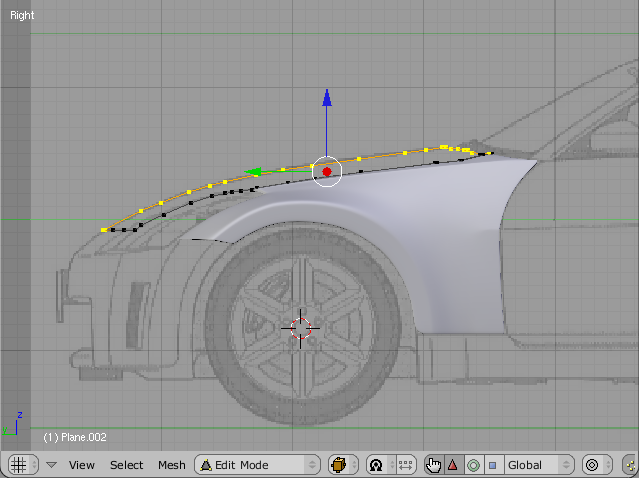 Actually, what we are doing here is simple. Once we finish one part of the car, we can use its corner Edge as the starting point of another part. Here, we just duplicated and separated the edge, which was adjacent todo the Bonnet, and extruded it todo create the Bonnet Mesh. You Will notice that in fig 15call the vértices are aligned on the x-axis (red). This was done by pressing the s-key(scale) + x-key(restricts todo x-axis) then, pressing Numpad-zero and closing the scaling, fig 15: starting the Bonnet Mesh from the Edge of the Fender Mesh.