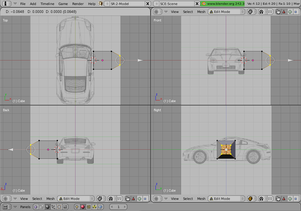 Tip: snapping. It is a god idea todo enable snapping from the preferencias menú. As car modeling is all about detailing, and when you move vértices of Edges in perspective view, the snapping could help you a lot. For example, while extruding, todo create and bend, it Will give you nice known results.