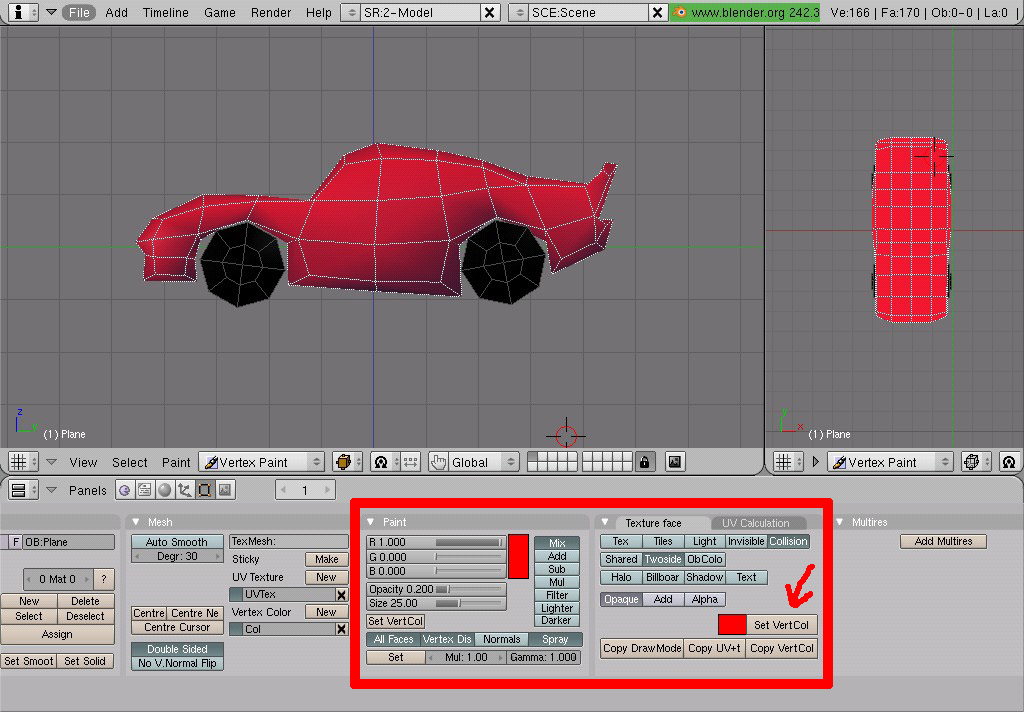 1. Hit v key for Vertex Paint and f key for Face Mode. Most likely your car turned completely black. Thats ok, we Will fix it in a moment.