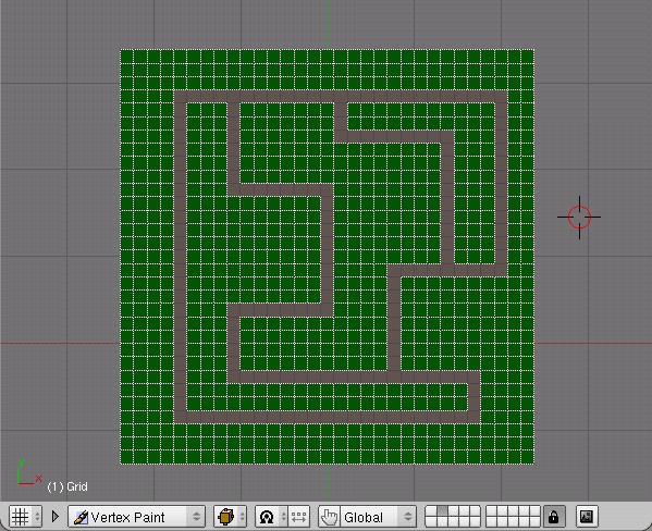 3. Using the same technique, create valleys by moving do, not up. Also, dont be afraid todo select portions of your track and move them up or down also. You can a los use the select>random in the file menús. After playing around, this is what i got. I added some Vertex Paint todo break up the flat grens and Brown colors. Se fig 14. (you might discover when you get your gamelet set up that your Terrain is a Little todo rough, this can be solved by applying a Subsurf modifier todo Smooth it out a Little).