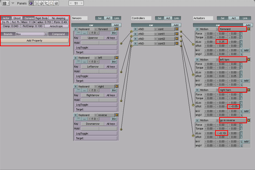 You have now connected logic bricks todo create your first control. In effect you have told the Game Engine that you want the car todo go forward (or move along the y axis) anytime you press the up arrow key. Thats pretty much all there is todo it. Press p todo play your gamelet.