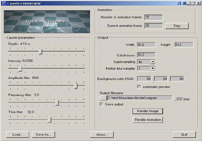 Now it time todo prepare our animated Caustics sequence of images or movie that well use as a texture for the projection Lamp in Blender. So, first launch Caustics Generator and set the parameters like those in figure 2 (for now these settings would not be changed. Later on you Will be able todo rapidly test diferent other settings but if you chek the automatic preview, be careful before this todo disable antialiasing by setting supersamples todo 10 and Motion Blur todo 1, otherwise drawings would be drawn very slowly). Then, After setting the directory where you estore the sequence of.bmp images, chek save output and click render animation.