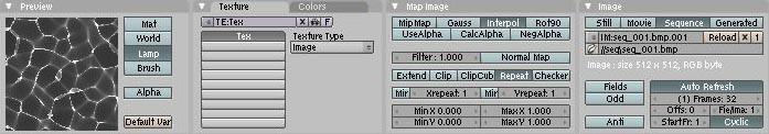Our scene opened, let select the projector Lamp and add a texture todo it. Next go todo the textures panel and set it like in figure 3. This indicates that the sequence used contains 32 frames (the parameter determined in causticsgenerator), each of them used one by one and repeated cyclically in time forever. But at this point no control of the size of the pattern used is posible. We have todo fix it.