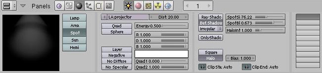 - projector Lamp: first of all, add a spotlight in a clear 3d window in Blender, and turn it more or less downwards. Set the spot as a buffered- Shadow, then in a classic-halfway toggle, then the spotbias angle more than 0.5, todo soften the border, and make it halo.