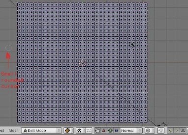 step1: first, in Blender, lets create a horizontal plane (go todo top view [Numpad 7] and click add>Mesh>plane). Press the s-key todo scale it todo nearly fill the view and then left click. In Edit Mode, press the f9-key todo subdivide it, say 5 times, then deselect all by pressing the a-key. Press the b-key twice todo obtain the brush selection tool. Use the mouse whel todo adjust the size of the brush until it about the size of a face, like in figure1.