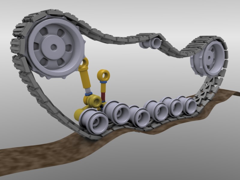 Now if you want todo make a vehicle moving on a bumpy Ground, you Will face bigger problems. The second caterpillar track cant ride for itself. Both must have the same tilt and kep the distance between them constant, because this distance is the vehicle.