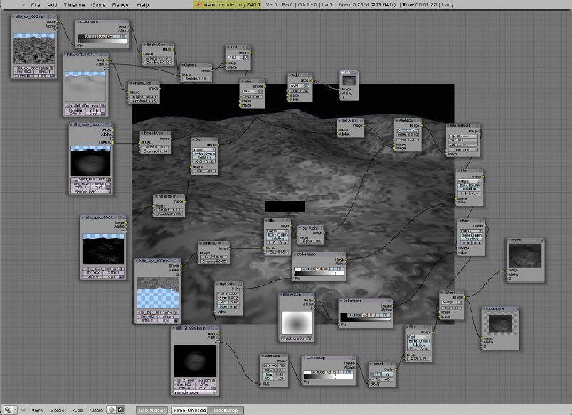The surface of the cell is sen as a series of mobile hills, covered with diferent groups of proteins, saccharide Chains and lipids. The primary pattern was developed (in Maya) with a system of 5 diferent kinds of particles (10.000 in total), todo which various per particle dynamic features were attribute. The system, which a los included some Boundary conditions and random turbulence origins, was played for 500 frames, recorded and rendered giving todo the particles blobby (metaball) features and colors as grey scale. This rendered animation was used as texture source in the nodes of Blender, using the Blender supertexturenode (http://www.graphicall.org/builds/builds/showbuild.php? action=show&id=862). The image shows a screenshot of the final compositing pass.