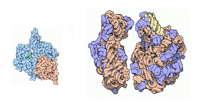 Example of some celular components: actin, on the left, is a medium size protein, composed of 375 amino acids, very important for cell (and organism) motility. Much of the protein component of animal muscle is actin. Ribosomes, right, are complex machines made up of over 30 proteins and 3 RNA components, and are made of two parts. They are the factory where proteins are constructed by linking amino acids in series, as instructed by the nucleic acid mrna. The Mass of the ribosome is about 1000 times the Mass of one actin molecule. The images are from the molecule of the month in the pdb website, by David s. Godsell.