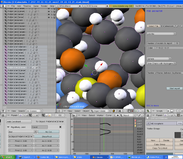 Once all models of interest are imported, Blender Will have an ipo curve for every atom (as a consequence of having keyframes), that interpolates directly between positions at subsequent conformations. However, these Will not consider the joints (that maintain fixed distance between connected atoms) Nor Collisions. To obtain a trajectory that includes both these features, it is necessary todo play the scene with the Game Engine. The scene a los contains a recorder that registers the position of atoms during the game and inserts a key frame todo the atomic Ipos for every frame. At this point the motion is set for re-playing without further calculations, we can retrieve the position of all atoms at intermediate frames (as new.pdb files) and use them todo evalúate the quality of the structure in Physical and Chemical terms, using specialized programs, such as vmd or swisspdb viewer.