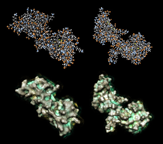On the left Cam is calcium-free, and on the right, calcium- Bound. Structural changes are not very large, yet the surface properties undergo a major transición, notice the Shiny spots, that indicate protein activation: this is where it Will make contact with other downstream efector proteins, thus efectively transducing the signal within the cell. The rendered images are shown with green and yellow colors todo indicate polarity of the electric field, but during animation the colors are not necessary, because the particles travel towards or out from the protein surface.