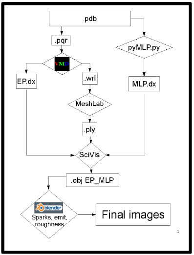 The actual aspect of objects beyond the resolution límites of our Sight, is something that does not exist. Nevertheless, it is posible todo represent the space occupied by the atoms of the molecule, and todo attribute todo its surface visual properties todo indicate some of its behavioral features. At nanometer scale, concepts such as color, brilliance, roughness, opacity and so on have no meaning, instead we face properties such as pH (acidity, or proton concentration), electric potential, hydropathy, oxidizing or reducing power and others. Among the most relevant properties that affect molecular behavior are the electric potential (ep) and the molecular lipophilic potential (mlp) that indicate the tendency of a surface todo attract or repel other charged molecules, and the afinity or repulsiveness for water, respectively. In an efort todo display the behavior associated with ep and mlp of the molecules, we have performed some steps that permit todo import values in Blender, as schematized in fig. 6.
