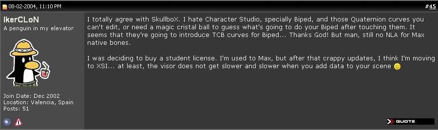 Iker, después de todo lo que hemos pasado te vas con otra y dices cosas sin sentido como que prefieres XSI al max, no tienes perdón, alma de cántaro, y en CGtalk, nada menos.