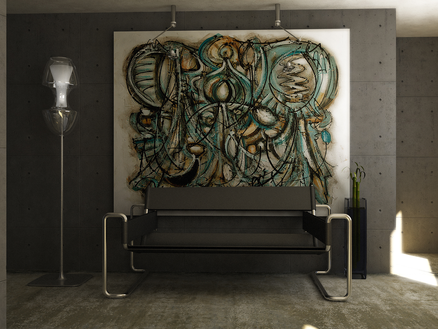 Le vas a poner luces o solo vas a dejar la natural? Sea como sea, es una imagen impactante que te quedas observando un rato, las texturas que has dado creo que encajan a la perfección, de hecho, yo estoy buscando una parecida a la del suelo para conseguir un suelo de cemento pulido guay, lo único que retocaría son dos cosas, los juncos de la maceta, para mí gusto son muy gordos y grandes, seguramente porque habrás escalado una maceta (objeto) más pequeño, yo pondría espigas de flores secas u alguna planta más estilizada y delgada y el sofá (sillón escalado en horizontal?) creo que no pega, creo que estorba la visión del cuadro, yo pondría una mesita baja de cristal o un mueble alargado oscuro, para que el cuadro quede bien insertado como el centro de atención de la imagen, no sé si me entiendes.