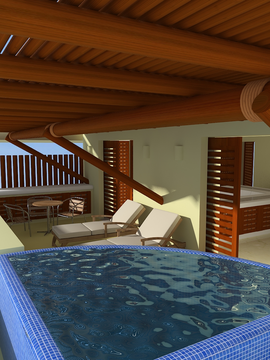 Veo que el agua esta sobre el borde del yacuzi (como se llame), aunque queda bien a esa altura, yo lo bajaría un poco ya que si entrara una persona rebosaria fuera parte del liquido. (esto es ya apurando renders hacia la realidad más pura, pero no hace falta que la bajes).