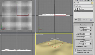 Volver a la capa de plano (box) y cambiar tanto segs largo ancho y segs a 32. Ahora puede decirse que este da una geometría muy bien definidos a través del paisaje (*.png) hemos creado en Adobe Photoshop.