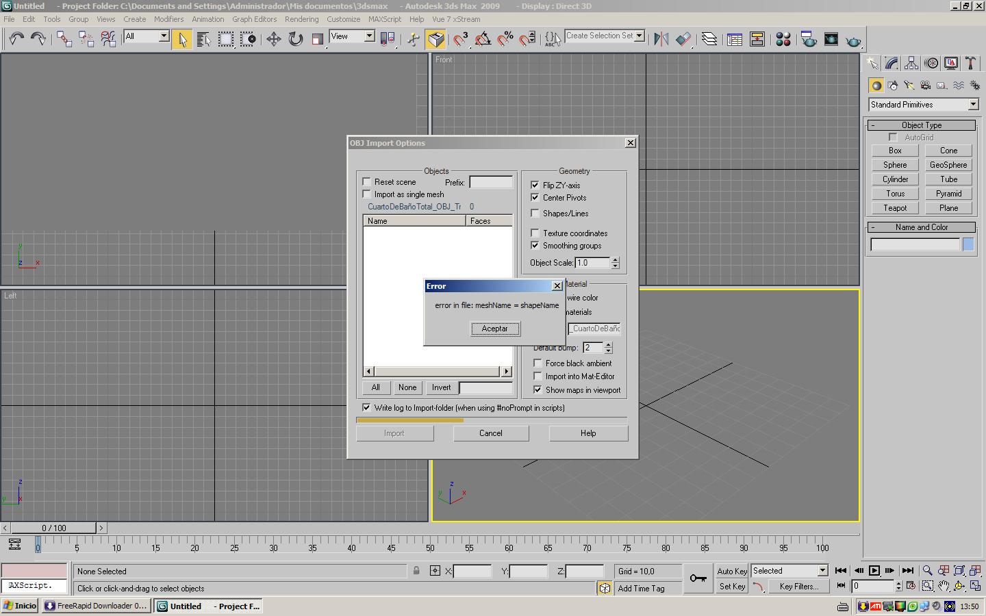 Hola gente, de 3dpoder he intentado exportar un geometría de LightWave a 3ds Max lo que hago es, primero que todo triangular la malla en LightWave y después le doy a exportar a forma (*.obj), cuando quiero importar la malla a max me salta este error que no sé qué significa o cuál es el problema, alguien sabe que puede será.