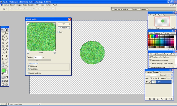 1-abrimos un nuevo documento, creamos un círculo del tamaño del ojo, lo rellenamos del color que nos guste, en este caso verde y aplicamos un filtro/ruido/añadir ruido con valores de 50/Gaussiano.