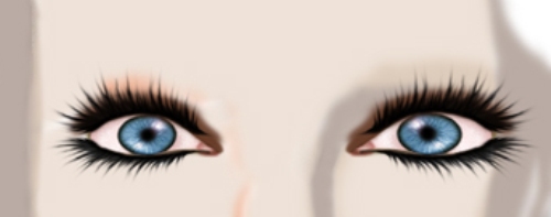 4- La forma del ojo la creamos con las pestañas, creamos una nueva capa para cada una de las pestañas y utilizamos un pincel con forma de pestaña color negro, estos pinceles los encontráis en distintas páginas, yo lo he sacado de Devianart. Es la forma más sencilla de hacerlo, una vez las pestañas colocadas debemos acoplarlas a la forma del ojo con edición/transformar/distorsionar y quedará algo así.