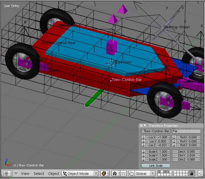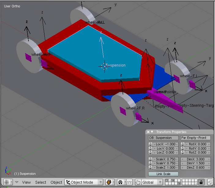 -The Purple object named ster-pointer has two vértices in two groups. They are used as tracking targets todo control the transversal slope of the suspensión object and the rotation of the stering whel.