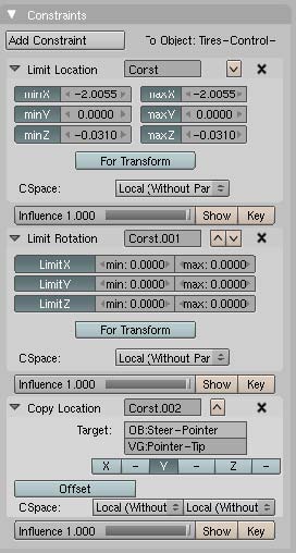 The location of the empty-stering-target can be defined in two manners. In the current blend file, this Empty is parented todo the chasis of the car, and afected by a negative time offset (-1.5 frame). As the distance between the chasis and the Empty vary with the speed this time offset has todo be ajusted each time you make an important modification in the speed of the car. If you use a curve as a trajectory guide for the car, you can apply todo the empty-stering-target a Clamp todo constraint, as you do for the empty-guide, or the empty-front. By moving the Empty along the curve, you can adjust the distance between the chasis and the empty. As they are driven by the same Loc IPO, this distance Will remain constant independently of the speed.