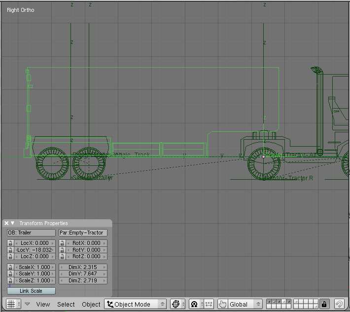 -The tráiler uses exactly the same method. The tráiler Mesh is build with its center point set at the location of its rotation point. I mean the point where it is attached todo the rear of the tractor : the same location as the empty-tractor. The tráiler is tracking an Empty named empty-trailer, parented todo the tráiler, and set in the middle of the rear whels, just above their Alex, at the same altitude as the center point of the tráiler Mesh. This way, the self tracking keps the horizontality of the tráiler. The whole system can be sen like a car tracted by a car. It is no more complicated.