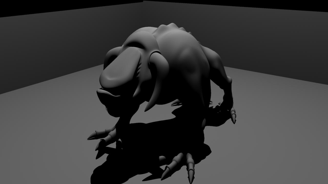 Pues te ha salido muy bien. Aun me acuerdo cuando yo también hice este tutorial. Para construir el monstruo se usaban solo curvas Nurbs y después un Loft para obtener las formas principales. Use esta técnica incluso para personajes, pero con el tiempo vi que no me servia mucho y pase al box modeling. Cuando lo acabes de texturizar te sugiero que intentes las mismas técnicas para crear algún otro animal o personaje ya que se aprende bien con este tutorial. Suerte con el texturizado.