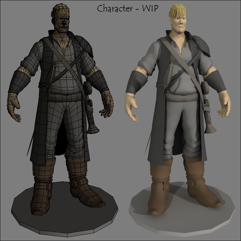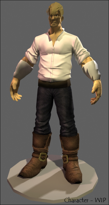 Sé que a nivel de texturas, el pelo esta horrible (incluso tiene algunas calvas que serían fácilmente soluciónables, pero me toca los huevos, la verdad, así como las bandas que sujetan el trabuco y el protector del hombro. Del mismo modo que las texturas de la manos son muy simples y feas. Obtuve una textura de pantalón que me agradaba, pero se quedó en el limbo en el famoso.psd perdido. Ya le preguntaré a mi PC un día de estos que hizo con ese archivo.