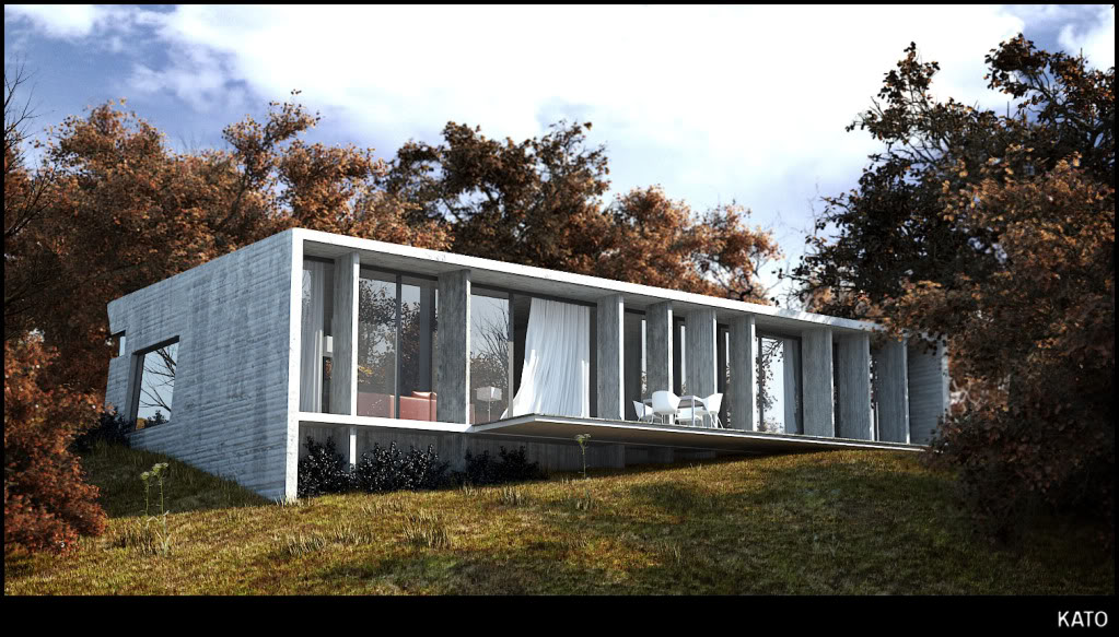Vaya, me recuerda la arquitectura de mies Ludwig Mies van der Rohe. Decime, has utilizado Vray Sun? La iluminación solar te ha quedado estupenda, has aplicado ilum, HDR? Por otro lado, has agregado la vegetación con ps?