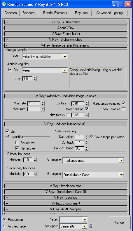 Soy un iniciado con 3ds Max 9 y un requeteiniciado con Vray 1.5 rc3. Eso si me lo leo todo y me veo todos los videos que corren por ahí. Pero hay un momento que ya no sé qué más hacer para arreglar ciertas cosas así que, ahí va, a ver si alguien me puerde echar un a mano. Os presento un interior renderizado con el motor de 3ds Max, y con materiales de 3ds Max, y el mismo archivo renderizado con Vray. Me salen muchos problemas a simple vista los veo, pero por más pruebas que hago y videotutoriales que leo, no puedo solucionarlos. Os adjunto también unas pantallas con las variables que he utilizado. Como veréis ahí diferencias entre los dos renders: