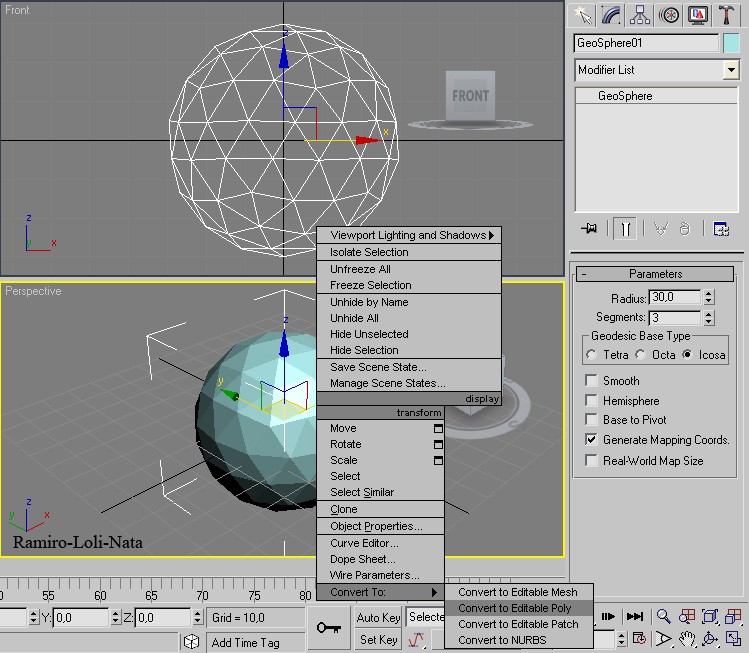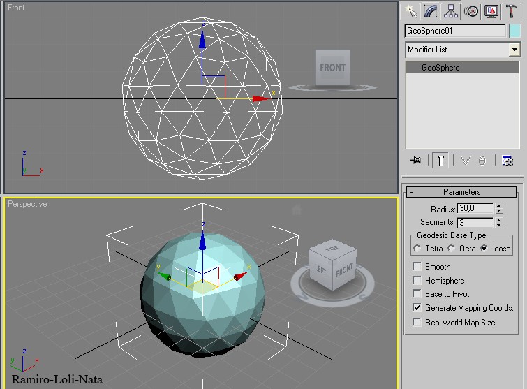 1.- Crear una geosphere de 30 de Radius y 3 de segments y en geodesic.