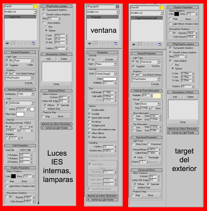 Y aquí la configuración de las luces internas IES, la externa y la Vray por si es la configuración de las luces y no la configuración del Vray.