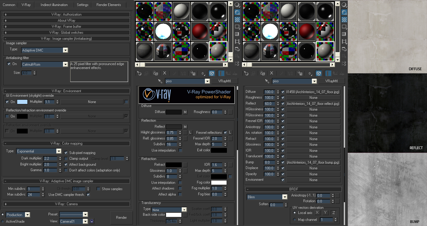 El piso está modelado, el material es de un archinterior dejo los settings de Color Mapping y del material del piso, algunos wires también, epserándo poder aportar en algo. Muchas gracias por tomarse el tiempo, para leerme.