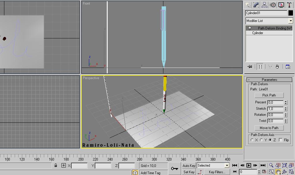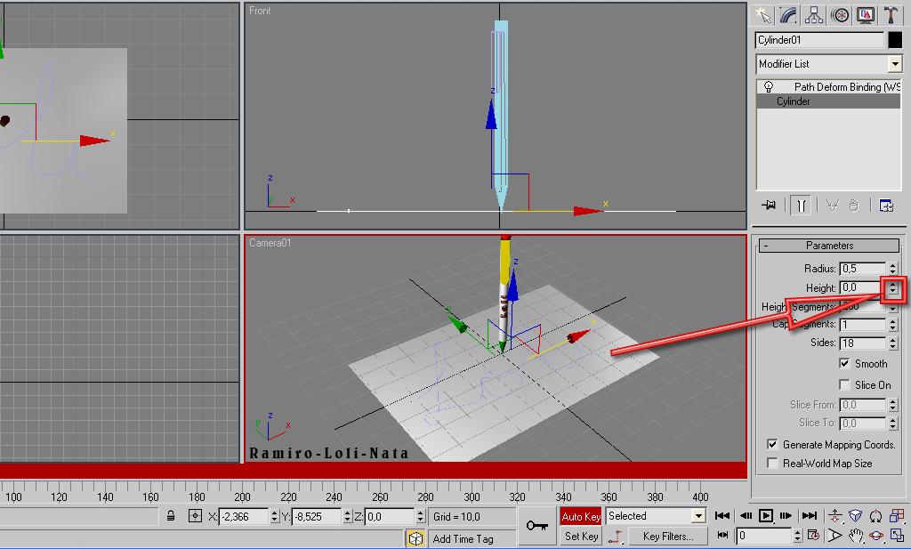 3.- Seleccione el cylinder y en la persiana de modificadores haga un click en el modificador Path Deform (wsm).
