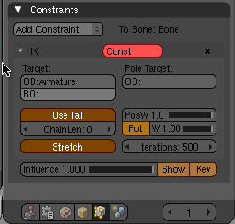 Y sobre el problema que tienes, ocurre lo siguiente. El armature es un objeto, como un contenedor, el hueso (bone) es un subobjeto, por decirlo así. Lo que has de hacer es poner en donde te pone ob:, el nombre del objeto armature, y si se corresponde, te aparecerá un campo en el que introducir el nombre del hueso. Esto se debe a que un hueso está dentro de un armature, y si tienes varios armatures en la escena, puedes tener varios huesos con el mismo nombre, pero no habría confusión, puesto que cada uno está dentro de su propio armature.
