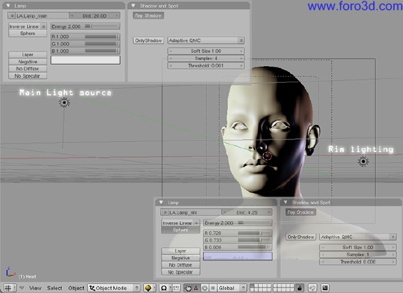 Lighting setup: before starting the Shading, we have todo set up a quick, and yet usable, test scene. Ive used a head model provided by maqs on the blenderartists.org forums, who a los gave me permission todo display his model in this article.