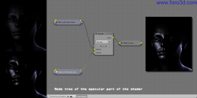 I think that all we can say about software reflections. Now all you have todo do is Insert your new Shader into the Nodal tree of the Skin Shader, and screen it above the Diffuse part of the shader. If you want more realism, you might want todo use two layers of software reflections so as todo replace the old speculars. It would be lógical, since we a los called two Specular terms in our original Nodal tre.