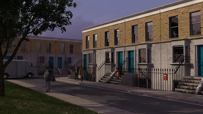 Aquí os dejo mi visión de una calle inglesa. Necesito críticas. Solo comentar que tengo poca experiencia y el dibujo esta sin acabar. Está hecho con max 2009 y Vray. Adjunto las nuevas modificaciones. Por favor, que alguien le saque fallos para poder mejorar.