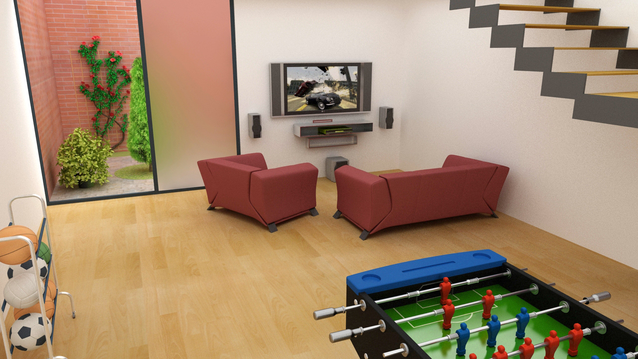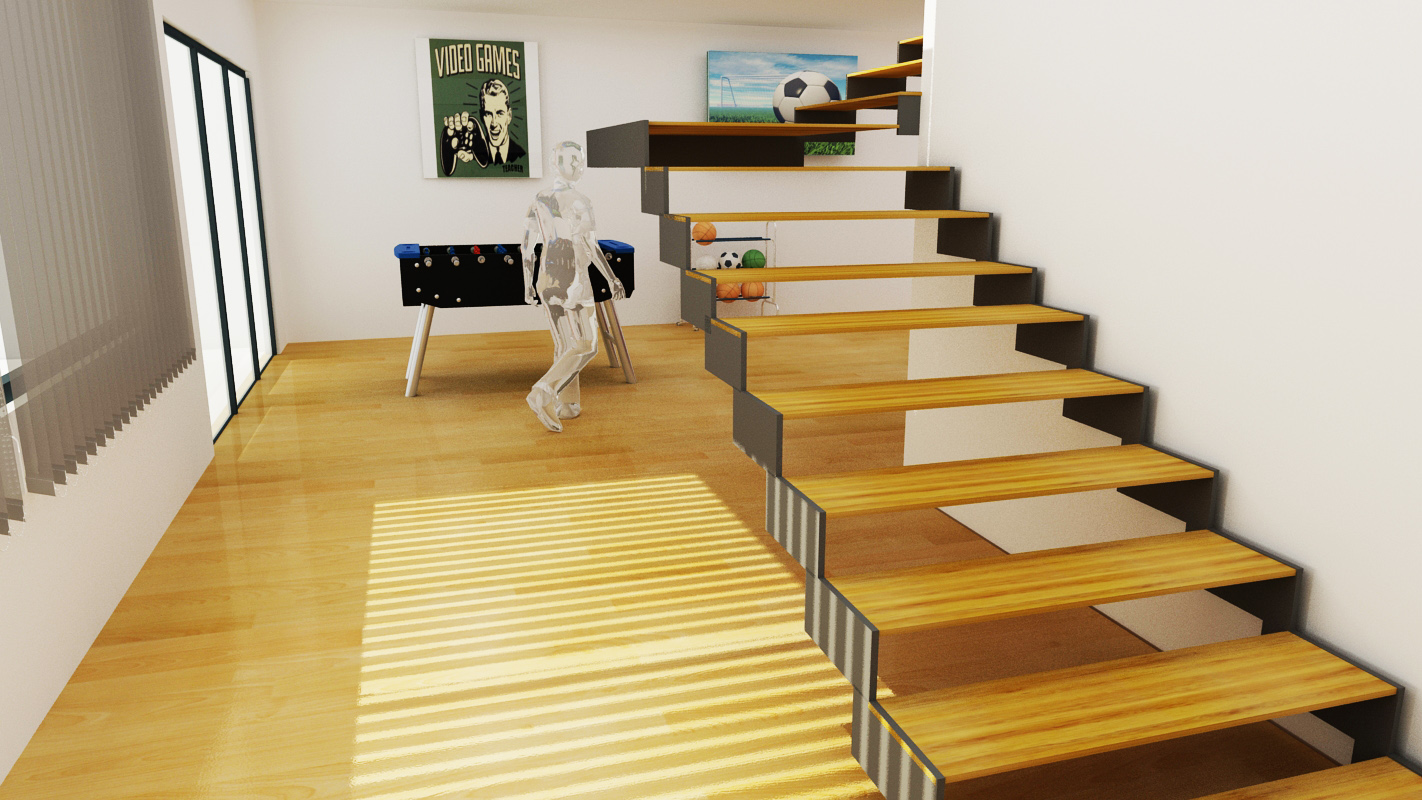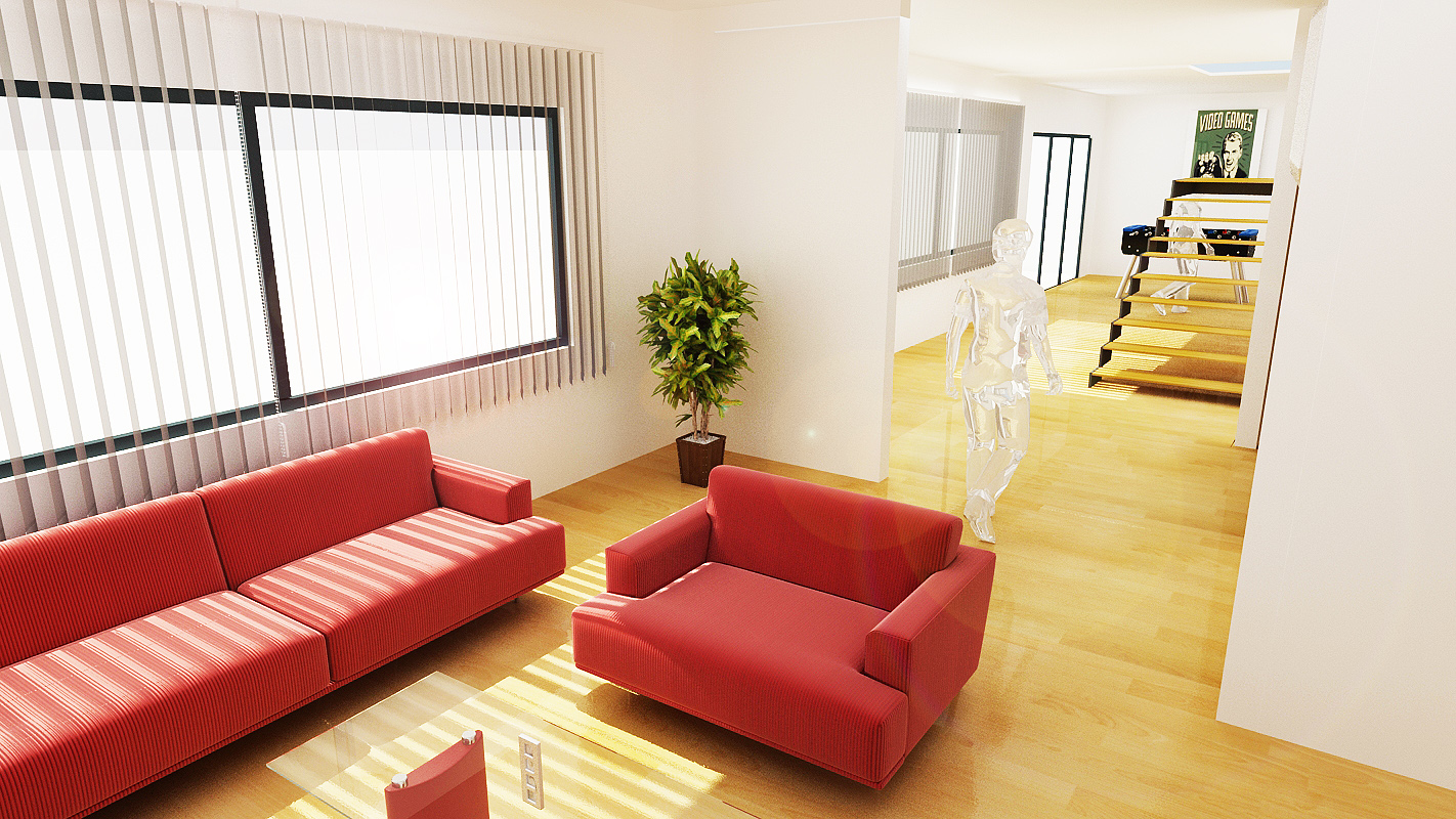 Bueno vamos por partes. Tu exterior, está todo demasiado saturado, los cristales son totalmente opacos y la iluminación te queda mucho por aprender, por otro lado, me encanta tu césped. En tus interiores la iluminación se ve bastante mejor, pero, esas escaleras parecen que están en suspensión, quedaría mejor si pusieras algún tipo de sujeción. Seguramente otros compañeros te dirán algún consejo mejor que el mío, tampoco me quiero pasar mucho contigo ya que yo estoy aprendiendo y no soy ningún profesional en esto de la infografía. Un saludo.