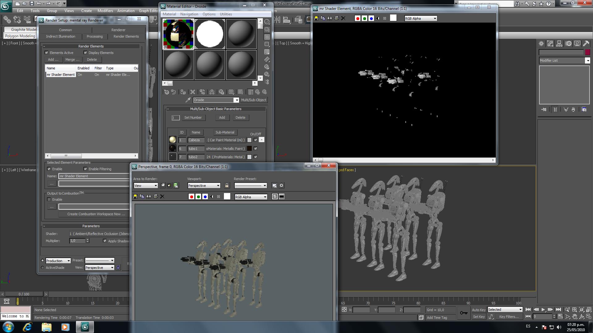 Hola gente, de 3dpoder estoy con un lío con el pass de render de Occlusion no sé por qué me está tirando las texturas negras, la escena consta de 2 obj en si un rifle y el robot, después se ha clonado y hecho el render, en si cómo se puede obserbar la occusion del rifle no tuve problemas, los materiales del rifle son bitmasps realizados en Adobe Photoshop, en cuanto a las materiales del robos son solo procedurales hecho cargados en un multi, los materiales usados son de Arch design y después se ha hecho prueba del render en Mental Ray, yo aún no sé si cuál es el problema, si alguien me tira un cable con esto agradecería, si necesitan más datos del asunto me avisan, con gusto los daré.