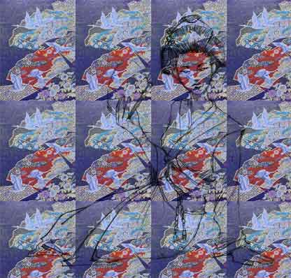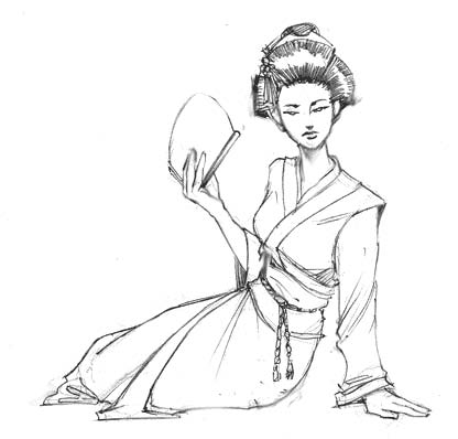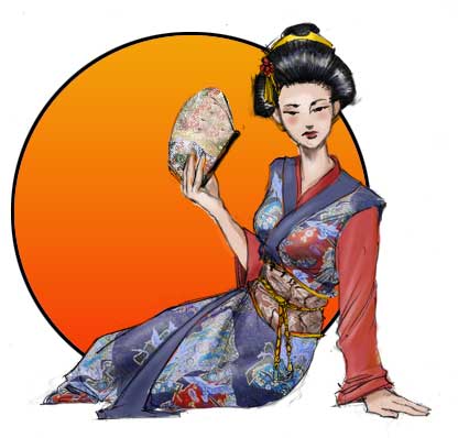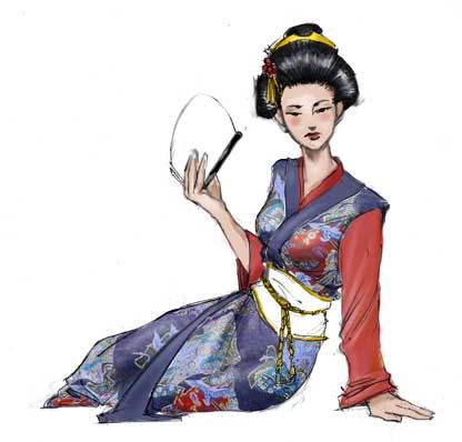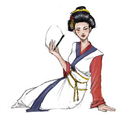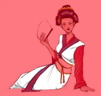 Da color a las porciones que no serán afectadas por el mapa de desplazamiento. En este dibujo lo que quiero es añadir patrones al kimono. Ya he escogido mi patrón y he usado el cuentagotas para adquirir colores complementarios del patrón para que el adorno del kimono quede bien cuando se lo aplique.